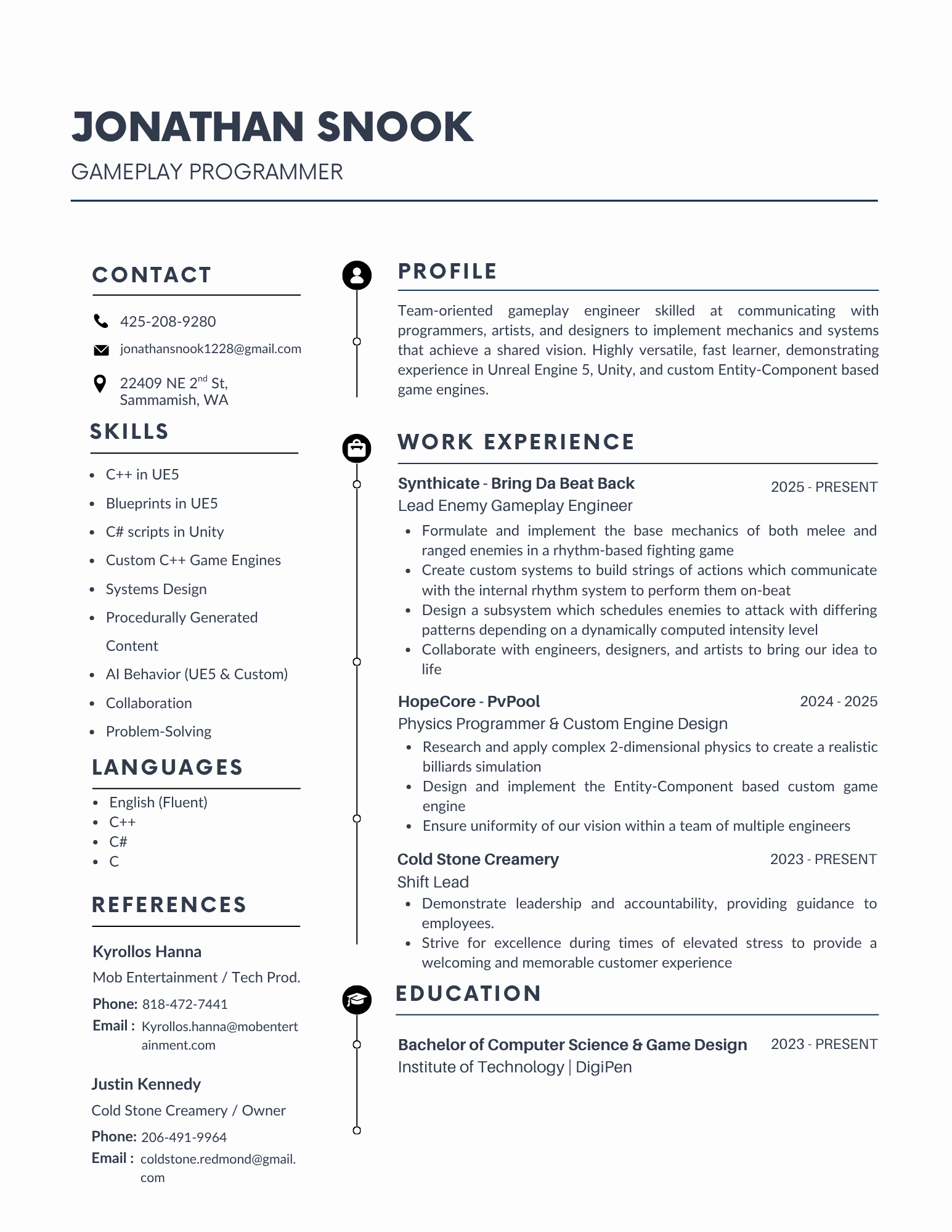 Hello, I’m Jonathan Snook!Gameplay programmer & systems designer determined to develop legendary video game experiences.Currently studying at DigiPen Institute of Technology for a bachelor’s degree in Computer Science and Game Design. Video Game Projects Bring Da Beat BackFight to the beat to bring music back to your robot infested hometown! PvPoolAssemble a team of ability enchanted pool balls to sink the evil billiard invaders! RE:PentTraverse through a deadly hellscape filled with the denizens of the Underworld! Doodle DefensePrepare your army to defend your sketchbook village against waves of enemies! My resume